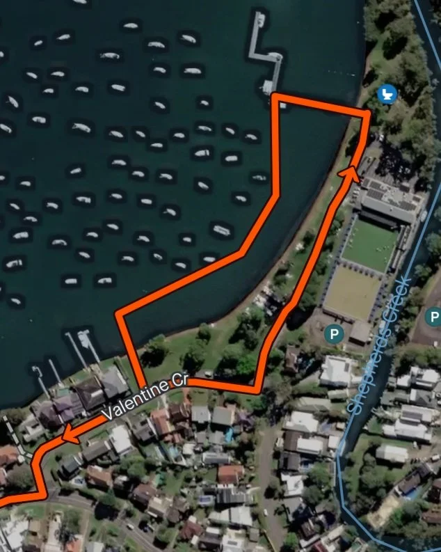 Run to Valentine Bowling Club wharf & swim back along parallel to park (300 - 400m)
