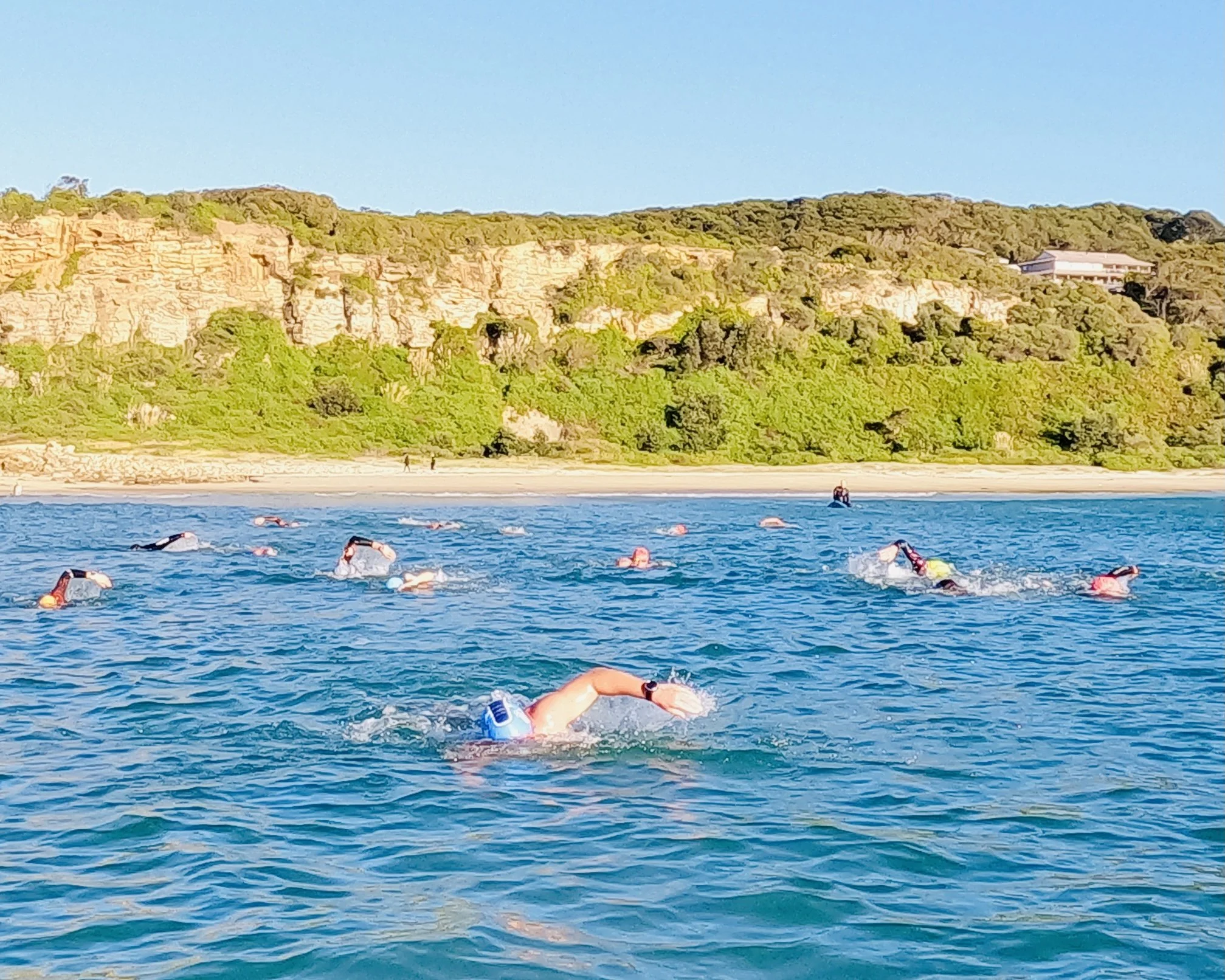 Swim #3 Dive Entry around headland to Nelson Bay Beach. * Faster athletes run back to dive entry point & do a 2nd swim if they have caught others.