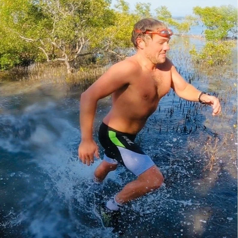 Swim Run is an amazing sport where you run and randomly jump in the water with your joggers on and swim! You get out & do it again & again! You very quickly get used to both swimming in joggers and running in wet shoes.