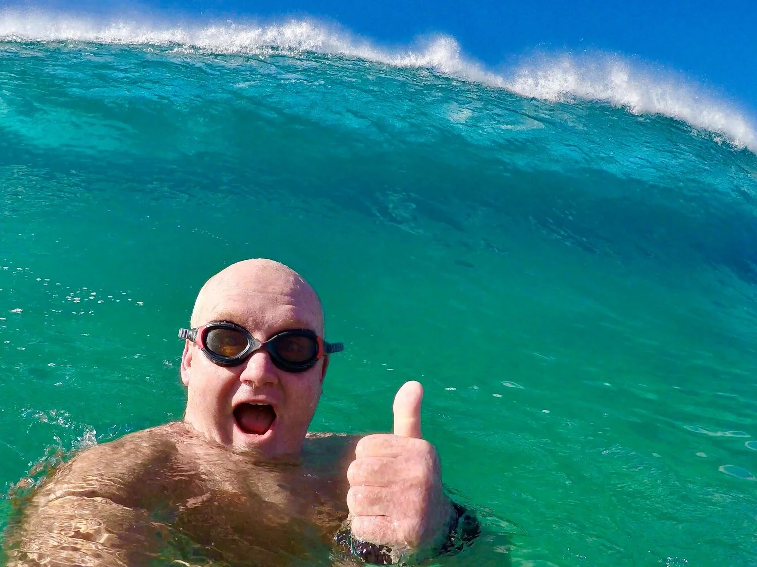 Coach Surfing next to the rocks where his Bros free him in aged 4 to see if he could swim
