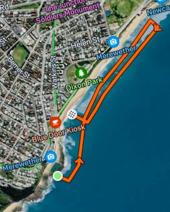 We Jump Off behind the Merewether Ocean Baths (0 - 3 foot swell) or start in front of the Surf Club (bigger swell). We meet Merewether Baths Huts either way. Coach Spot will make sure all swimmers get through the wave zone!